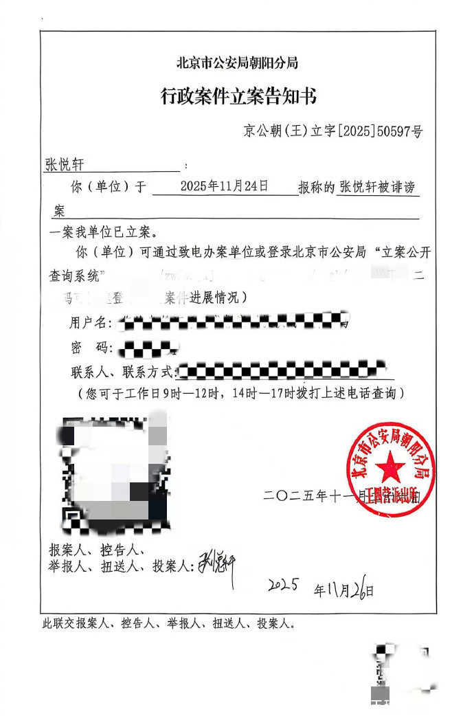 第一张图片是警方的立案告知书。从该告知书上可知,天天以被诽谤为由亲自前往派出所报案了,并已立案。