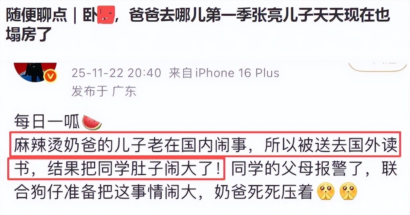一位娱乐博主以麻辣烫奶爸代指张亮。该博主说张亮的儿子经常在国内闹事,所以他被送往国外读书。