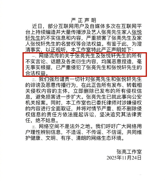 第二张图片是张亮工作室发布的一份声明。
